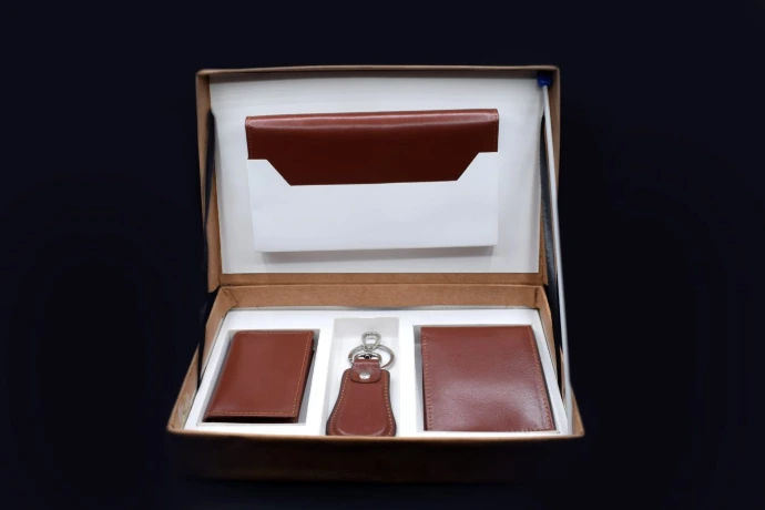 Vogue by Faiza presents a sophisticated and utility-focused premium leather 4-piece gift set, meticulously crafted from high-grade, genuine leather. This complete collection features essential accessories, including a stylish long bifold wallet, a standard bifold wallet, a compact card holder, and a matching leather key fob. The set is available in four classic colour, Black, Brown, Blue, and Tan—making it the ideal luxury gift for corporate clients, your husband, or any loved one who appreciates enduring quality and style.