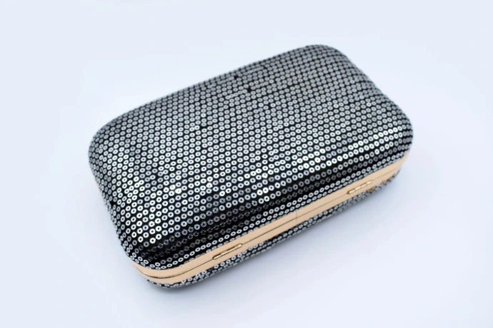 This elegant Sequence Clutch is a stunning accessory designed to add a touch of glamour to any evening ensemble. The structured, hard-cased body is entirely adorned with densely packed, shimmering black and silver sequences, offering a brilliant, light-catching texture. It features a polished gold-tone metal frame and a secure, jewel-embellished clasp closure at the top, perfectly blending practicality with eye-catching sophistication.